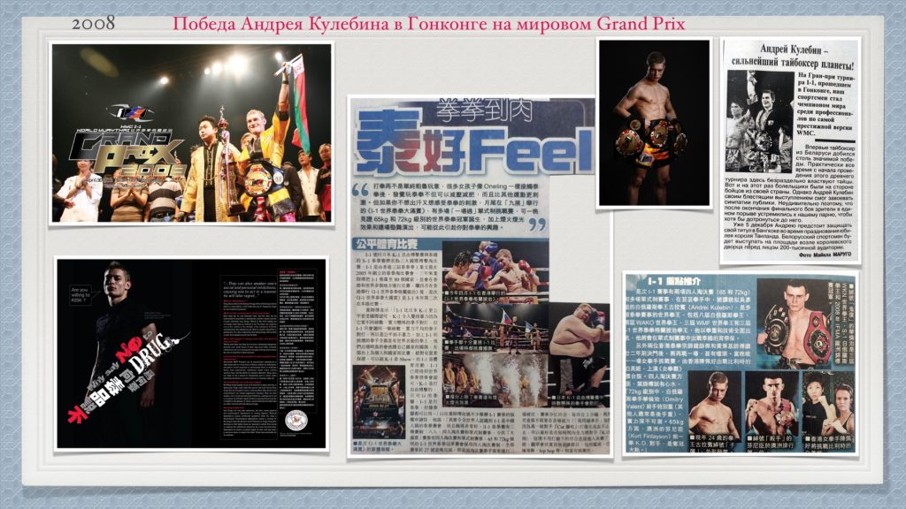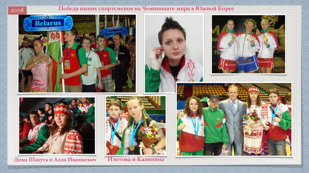 ЧЕМПИОНАТ и Первенство РЕСПУБЛИКИ БЕЛАРУСЬ ПО МУАЙ ТАЙ 2008 Бойцы клуба «Кик Файтер» завоевали 1 командное место, завоевав 10 золотых медалей. Золото завоевали: Заяц Андрей 54кг, Попов Алексей 57кг, Зенькович Андрей 63,5 кг, Кулебин Андрей 67кг, Варакса Денис 71кг, Дмитрий Валент 75кг, Елена Кучинская 54кг, Марина Калинина 71кг, и юниоры: Павел Ревтович 75кг и Егор Мордас 81кг.